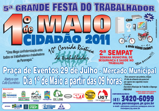 01/05/2011 09:00Com o intuito de promover uma confraternização entre os trabalhadores parnanguaras e suas famílias e atrair turistas de diversas localidades do estado, que aproveitam o feriado para viajar a lazer, a prefeitura de Paranaguá realiza um grande evento em comemoração ao dia do trabalhador na praça de Eventos 29 de Julho, oferecendo aos participantes, além de toda a estrutura necessária para o evento, uma vasta programação que conta com sorteios de diversos prêmios e shows artísticos durante o dia inteiro.